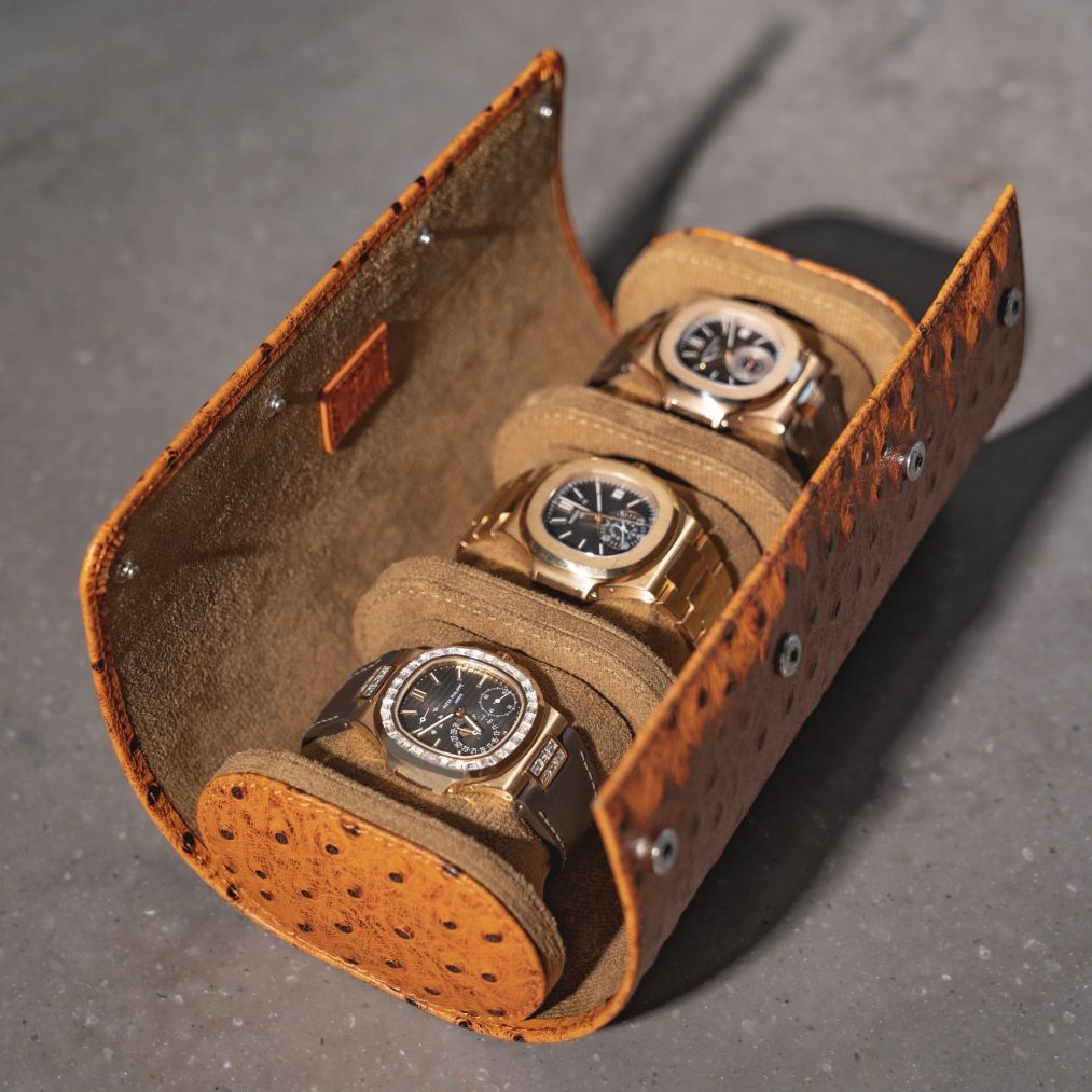 Etier Gusto Triple Watch Roll Tan Ostrich Leather
