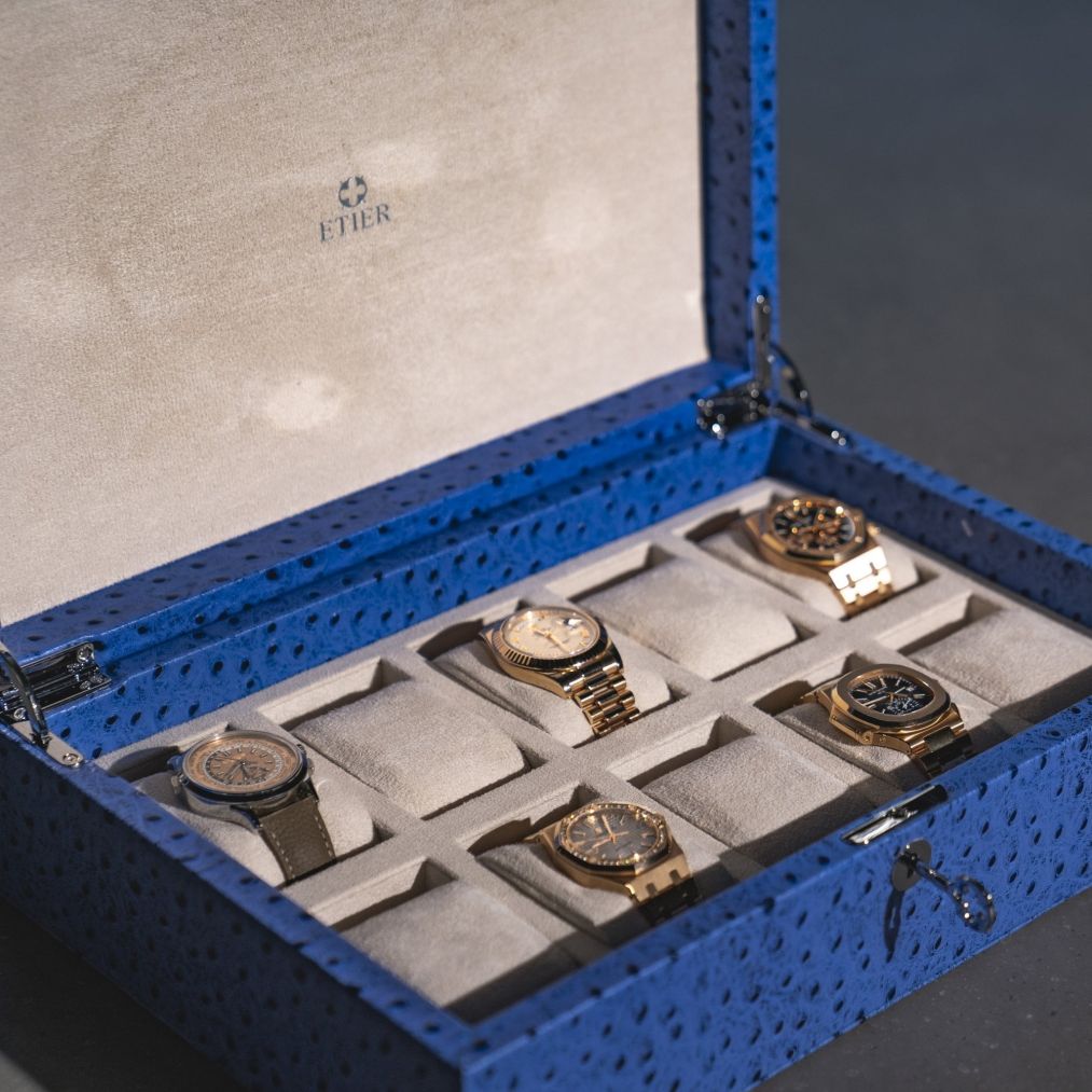 Flawlessly hand-crafted using the finest real leather, the distinctive watch case showcases the remarkable pattern of ostrich skin, finished in an opulent blue and expertly bound for long-lasting luxury. Along with a soft cream suede lining designed to further protect your watch collection from scuffs and scratches while in storage, the piece also features removable cushions for easy access, satisfyingly smooth glide hinges, a lock, and a signature Etier key with a high-quality chrome finish.