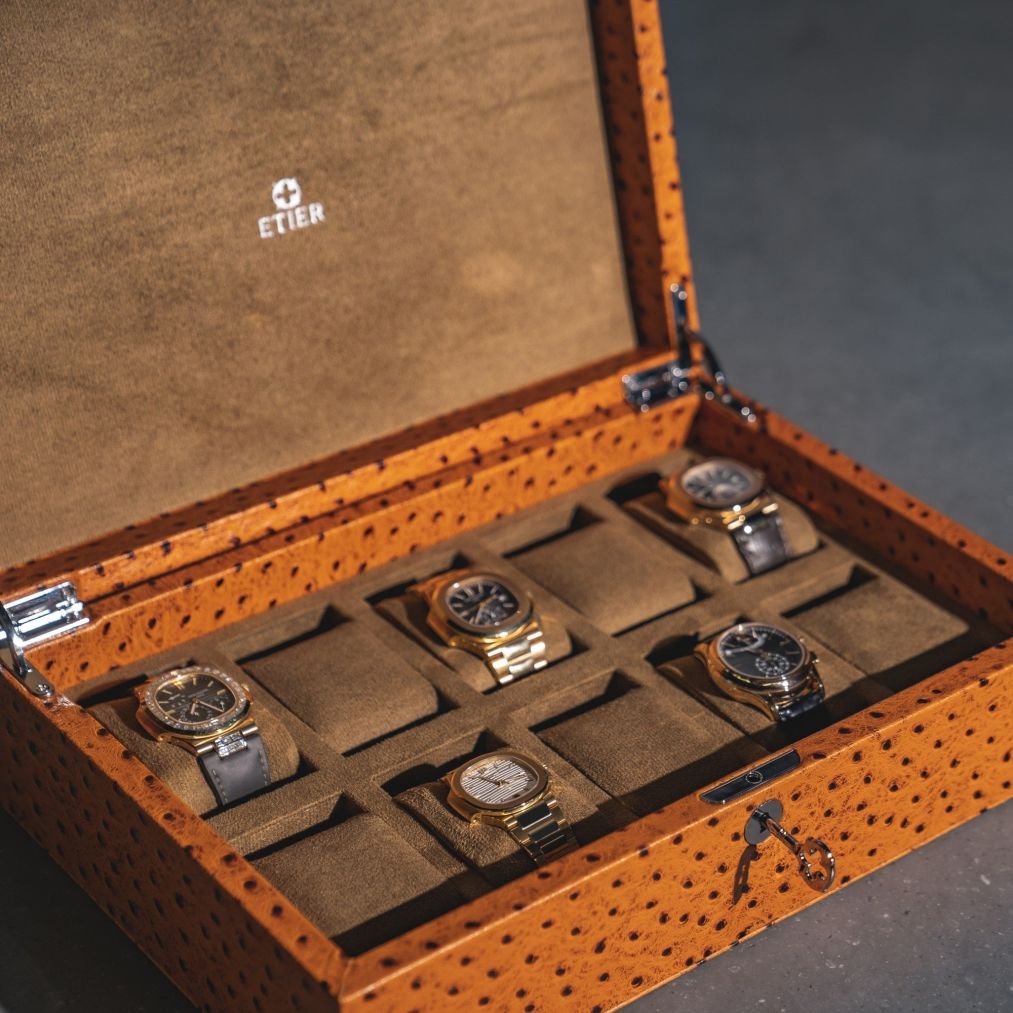 Complemented with a soft brown suede lining that safeguards your investment timepieces from marks and scratches, the Struzzo case also features removable cushions designed to provide easy access to each watch in your collection, as well as smooth glide, hinges with a high-quality chrome finish, and our signature Etier lock and key for additional security.