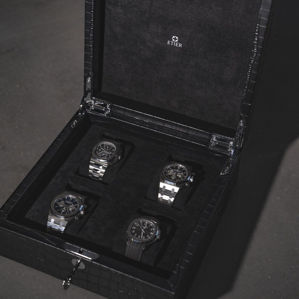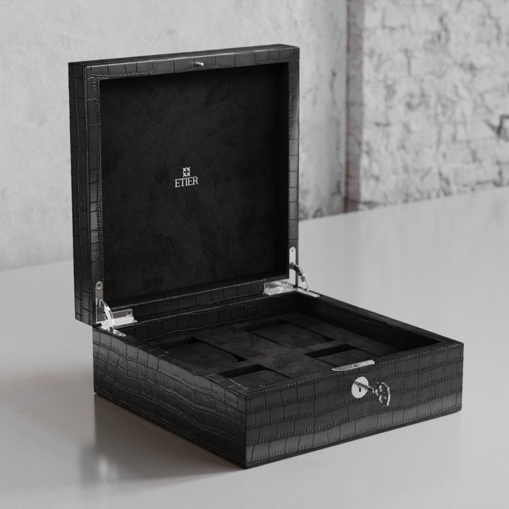 Skilfully hand-crafted, the luxury watch case is bound in real premium leather that’s been expertly pressed with the unmistakable polygon pattern of crocodile skin and finished in the timeless shade of black. As well as satisfyingly smooth glide hinges, secure lock, and signature Etier key - all with a flawless chrome finish - the elegant watch case also features removable cushions to hold each of your watches, as well as a soft black suede lining for additional protection for watch faces and bracelets.