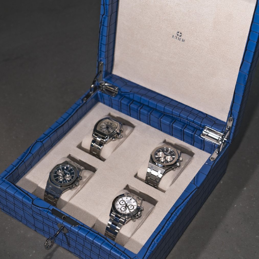 Hand-crafted to an exceptional standard, the luxury watch case is bound with the finest leather, which is expertly finished in a striking shade of blue and pressed with the distinctive polygon pattern of crocodile skin. For an immaculate finish, it also features high-quality chrome hinges with a smooth glide action, as well as the signature Etier lock and key, plus a soft cream suede lining to provide additional protection for your coveted timepiece collection.