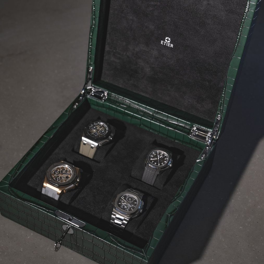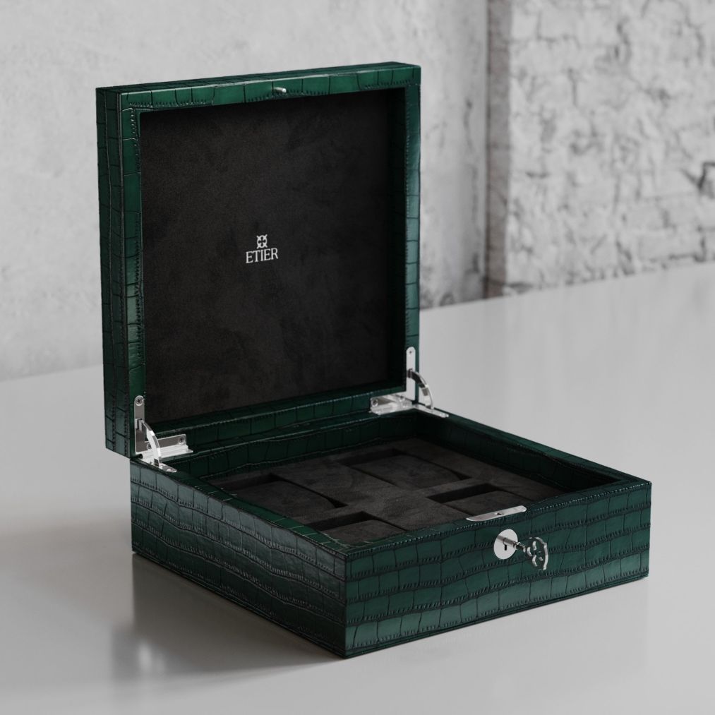 Hand-crafted to an exceptionally high standard, the luxury watch case is perfectly bound with real premium leather, which has been finished in rich green and beautifully embossed with the instantly recognisable pattern of crocodile skin. Alongside immaculate finishing touches such as smooth glide hinges and our signature Etier lock and key, the tasteful watch case is also lined with soft black suede to provide premium protection for your wrist watch collection.