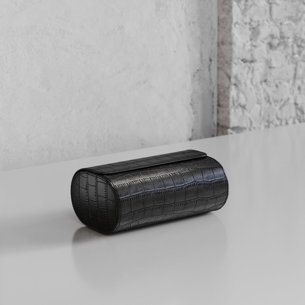 Featuring finely stitched edges and snap fasteners, the luxury watch roll is expertly crafted using the highest grade leather in classic black, and embossed with the ever alluring pattern of genuine crocodile skin. For additional protection of your investment timepieces, the Verdi Double Watch Roll also includes interior cushioning to keep each watch securely in position, as well as a soft black suede lining.