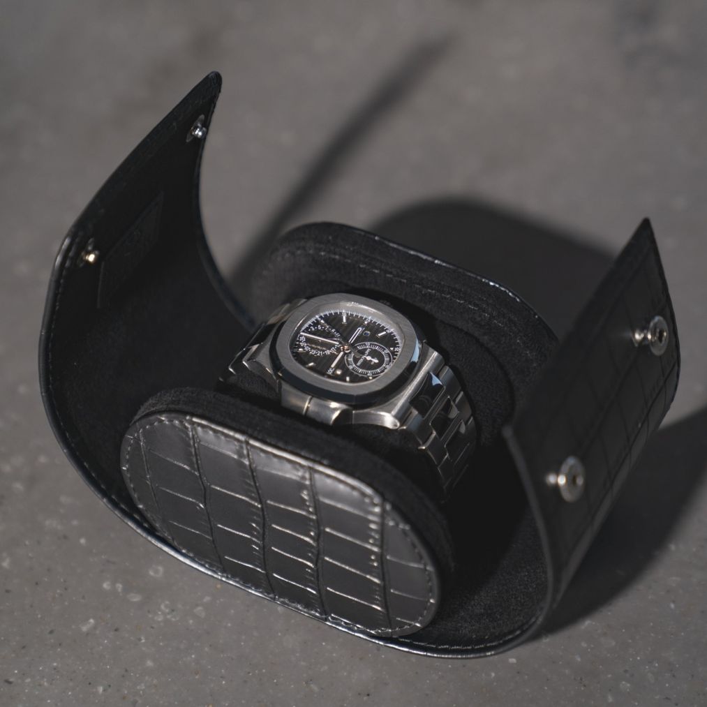 Made to last, the luxury watch roll is meticulously hand-crafted from real premium leather that’s been expertly finished in a deep shade of black that ages beautifully over time, and pressed with an unmistakable crocodile skin texture. With intricate side stitching, interior cushioning, a soft black suede lining, and leather snap fasteners to keep your investment watch secure, the compact accessory exudes quality, making it a firm choice for luxury watch enthusiasts.