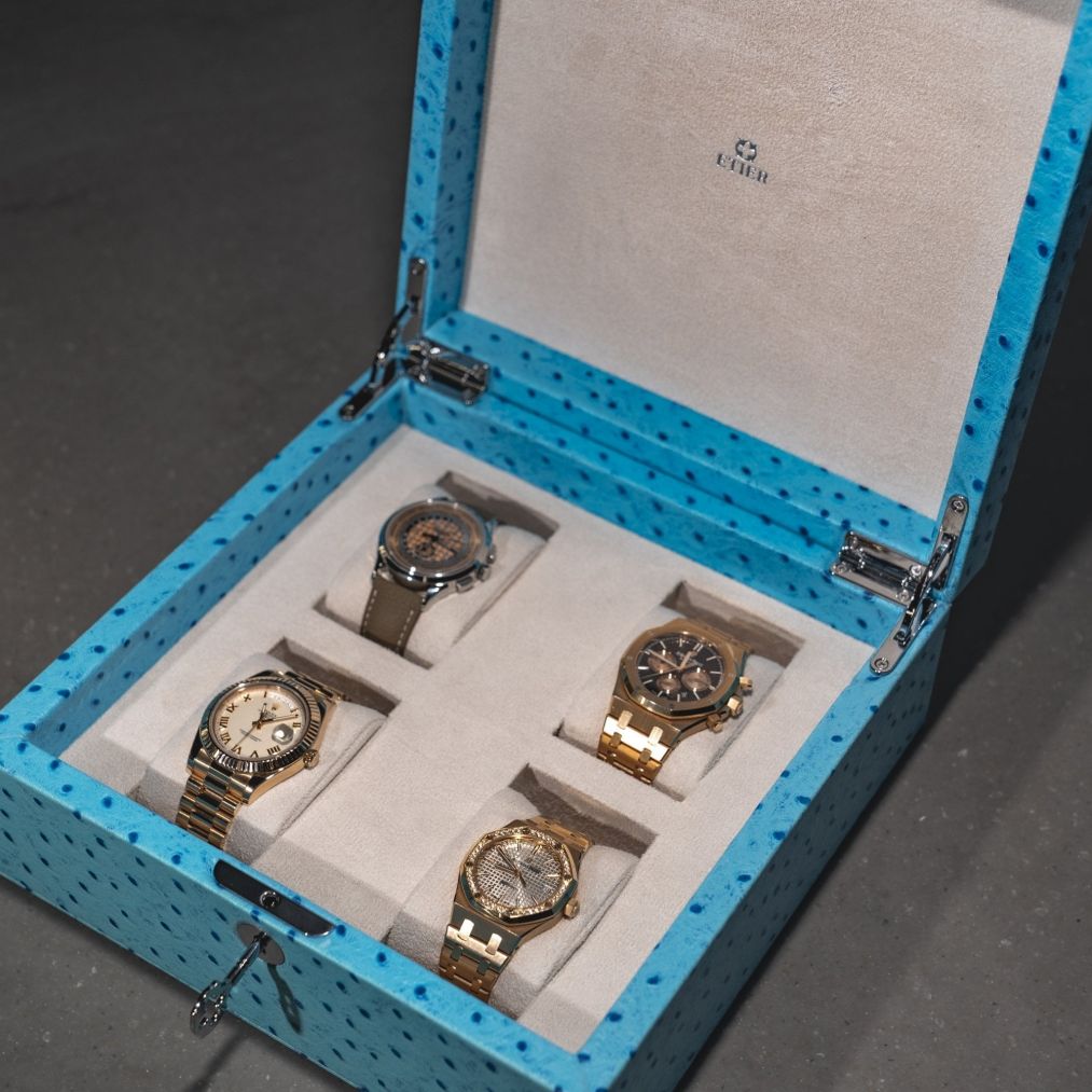 Masterfully crafted by hand, the luxury watch case is bound with real premium leather in the striking Aqua blue and embossed with the uniquely alluring pattern of ostrich skin. As well as featuring a luxuriantly soft cream suede lining and removable cushions for each of your watches, the flawless leather case is finished with immaculate details, including chrome smooth glide hinges, a secure lock, and our signature Etier key.