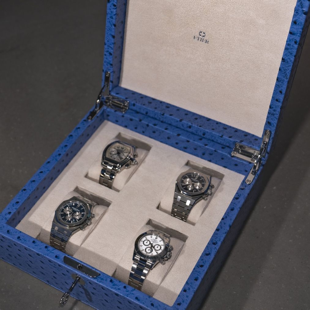 Etier Vigo Four Watch Case Blue Ostrich Leather