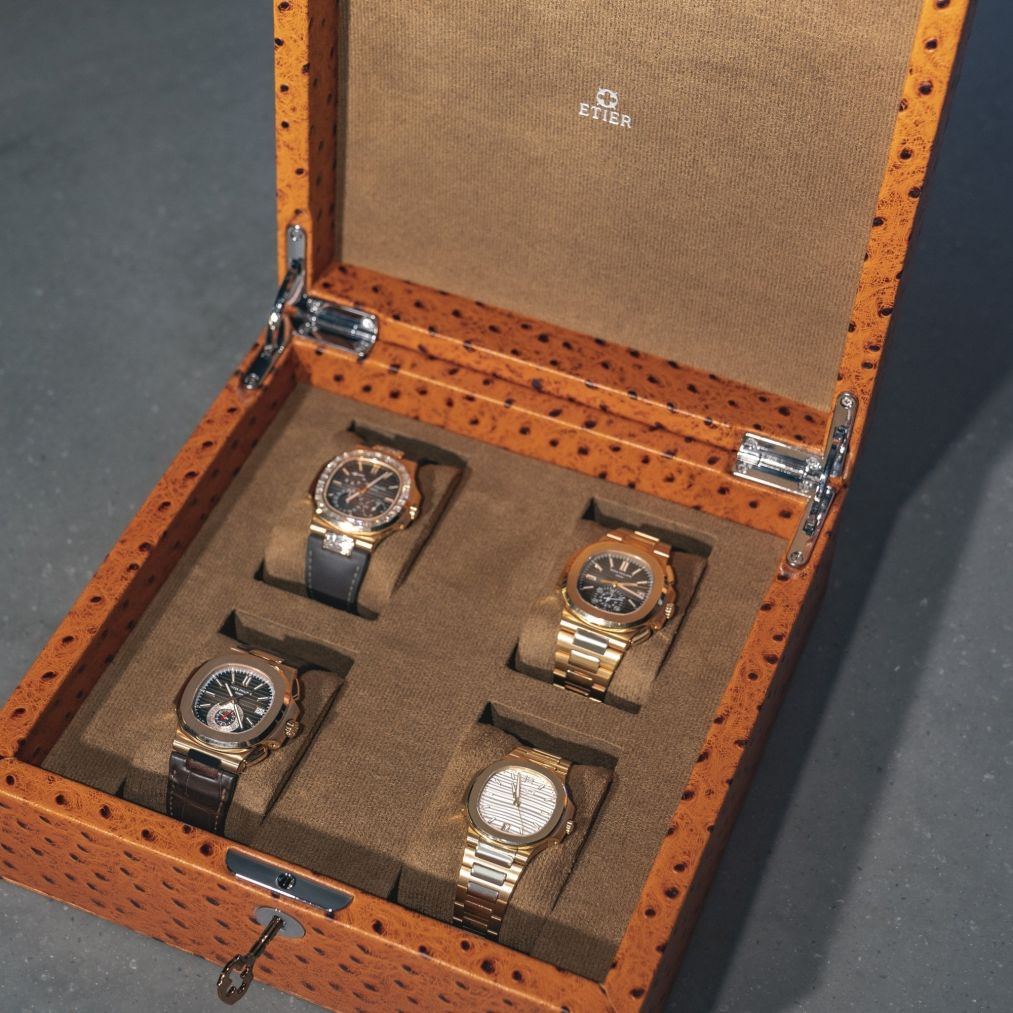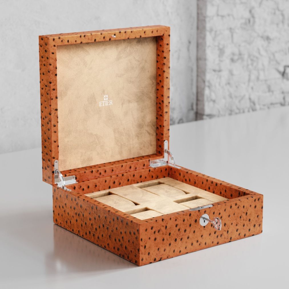 Meticulously hand-crafted, the luxury watch case is bound with premium real leather in classic tan, and perfectly pressed with the highly coveted and entirely unique pattern of exotic ostrich skin. Finished with luxury detailing including an ultra-soft brown suede lining for additional protection, chrome hinges with a smooth glide action, and our signature Etier lock and key, the deluxe case is the ideal choice for luxury watch collectors with impeccable taste.
