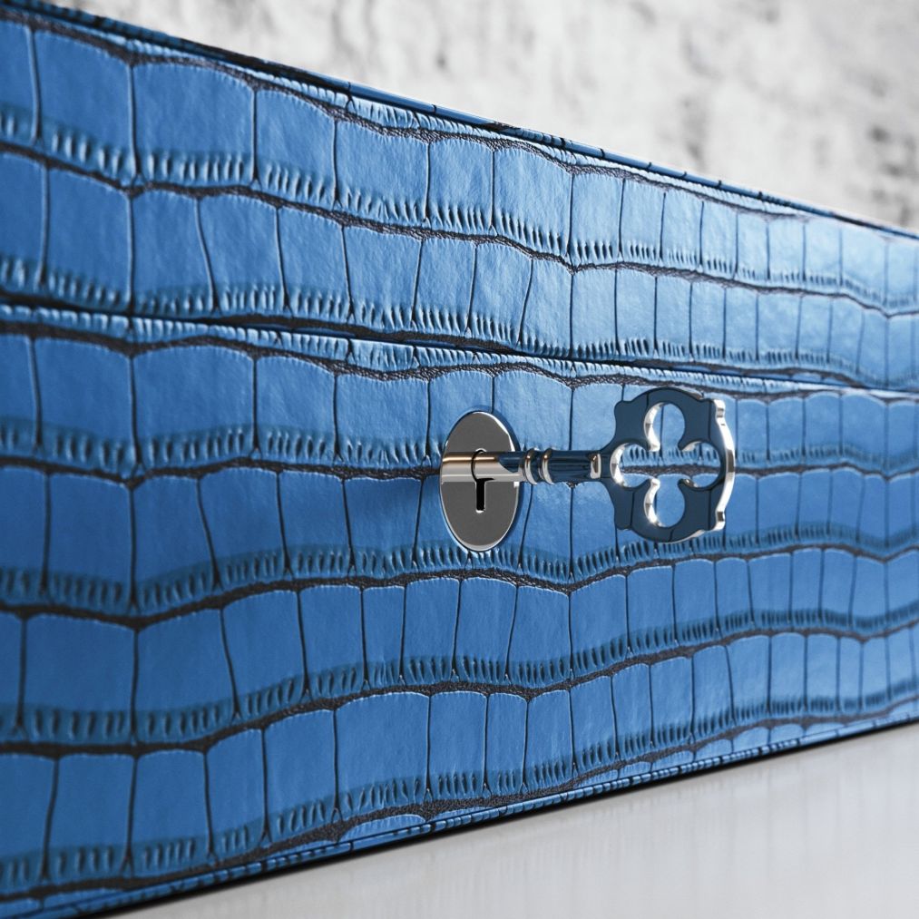 Skilfully bound in the highest quality leather with an elegant blue finish and distinctive crocodile skin texture, the luxury watch case is finished to an exceptionally high standard. Boasting chrome smooth glide hinges, lock and unique Etier key, the generously sized Zegato case also features soft removable cushions and a cream suede lining to safekeep your watch bracelets from marks and scratches, making it the perfect solution for your growing watch collection.